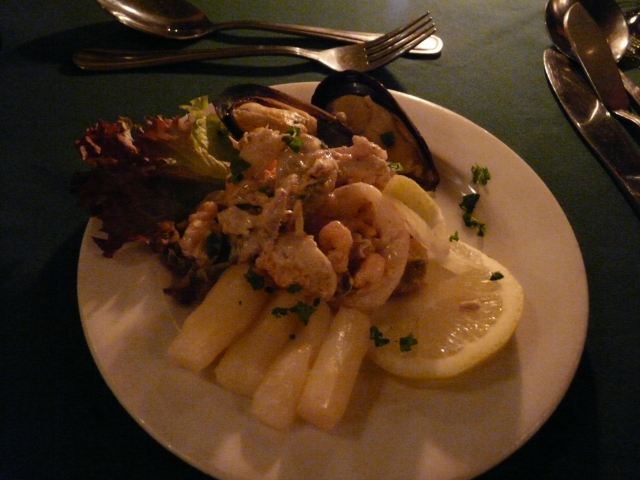 The room was ok, if a bit below par compared to the public areas. The food, however, sucked big time. Dinner is a table d'hote affair of four courses - soup, fish, mains and dessert. Our expectations were raised sky-high on the first night when we were served a superb vegetable soup with barley. Extraordinary. This was followed by a limp but edible piece of battered hake. With a slice of lemon. Then came the mains. Anna had braised chicken and I a fillet cordon blue. I could not believe that this stalwart of the 60's was still around. Fillet steak pounded into an oblong, topped with ham and cheese, rolled up, crumbed and slow roasted, The Armitel's version had two problems - the crust was like concrete and the thing was raw and cold inside. Ghastly. Anna's pieces of chicken were adorned with a transparent substance which we supposed was meant to be a sauce. It had the consistency of glue and a taste of raw vinegar. Needless to say, we went on to dessert which was an edible apple crumble. Breakfast was just acceptable. Except for Anna's fish cake which was old. Very old. Dinner the next night was worse. Anna had a sweet butternut soup which she pronounced ok and scoffed. In case this was the last edible dish of the evening. I had something that was described, with considerable literary license, as "mixed hors d'oeuvres". I got a small plate with two tired mussels and what appeared to be various bits of fish, shrimps and calamari with a pink substance clinging to it. It was indescribably vile. Almost impossible to believe that they could manage to get so much wrong on such a small plate. The mussels were tough, the calamari even tougher, the shrimps reeked of iodine (sure sign of age) and the fishy pieces were suspiciously fishy. To add insult to injury, the mess came accompanied by 4 pieces of tinned asparagus lurking on the edge of the plate, This was, I think, the worst food that I have ever been requested to eat. Here is the corpus delicti.