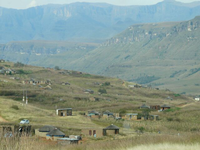 The woodwork in the rooms is interesting, the tree house concept sort of faery-like, but in the end the consensus was that the place is way overpriced at R750 per person, dinner and breakfast included. The folk running it are friendly and engaging, but are clearly in need of some professionalism. After a modest breakfast we bid adieu to Bonnie and Clyde and set off for Cathedral Peak. We wanted a spot right in the Drakensberg and CP, as us old hands call it, seemed to fit the bill. We wend our way through rural Kwazulu Natal, the landscape dotted by houses, huts, schools, kraals, cattle and goats.