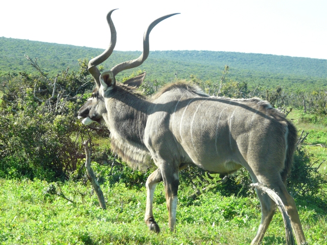 The mielies turned out hard, but still edible. We had salads and grilled chicken for Anna and a glorious T-Bone steak pour moi. The next morning we set out to explore the park. Addo was a huge disappointment. It is not the African bush - more like the African shrubs. No trees in sight at all, just low shrubs. This is just not what the flora in a game park should be. There should be trees, dammit! It does not feel right, somehow, to see the animals in the shrubland. The place is also seriously small. A 5 hour drive will see you negotiate all the roads in the park. Because of its size, the outside world is never far away and one frequently see Port Elizabeth, or a railway line or neighbouring civilisation in some form or other. Never got the feeling of being away from it all. The variety of game is iffy. Expect to see lots of elephants, kudu, warthogs and zebra. Very little else. Here are a few obligatory animal pics.