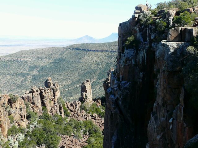 Off to Graaf-Reinet, where we intended staying one night. Sufficient time to see whatever GR, as we old hands call it. has to offer. Graaff-Reinet was founded in 1786 by Governor van de Graeff. He either really loved his wife, Reynet, or added her name to the town to get out of a tough spot. In any event, this makes the place really, really old in South African terms. We generally regard anything that existed before tv as ancient. On that scale Graaff-Reinet is practically prehistoric. The town lies in the middle of the Camdeboo National Park. We noted when passing through on the way to NB, that it is also home to the Valley of Desolation. So, off to the Camdeboo Park we went. And to the Valley of Desolation. Sounds sort of hellish, doesn't it? "Sally, if you do not eat your pumpkin, I will send you to the Valley of Desolation." Just before the actual Valley- at its portals, one may say, is a lookout point. Where one can look out.