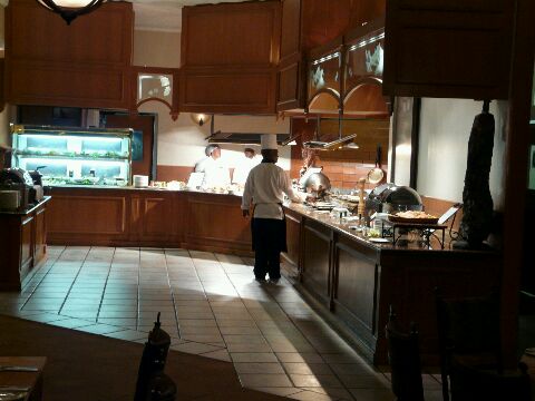 The room was ok, if a bit below par compared to the public areas. The food, however, sucked big time. Dinner is a table d'hote affair of four courses - soup, fish, mains and dessert. Our expectations were raised sky-high on the first night when we were served a superb vegetable soup with barley. Extraordinary. This was followed by a limp but edible piece of battered hake. With a slice of lemon. Then came the mains. Anna had braised chicken and I a fillet cordon blue. I could not believe that this stalwart of the 60's was still around. Fillet steak pounded into an oblong, topped with ham and cheese, rolled up, crumbed and slow roasted, The Armitel's version had two problems - the crust was like concrete and the thing was raw and cold inside. Ghastly. Anna's pieces of chicken were adorned with a transparent substance which we supposed was meant to be a sauce. It had the consistency of glue and a taste of raw vinegar. Needless to say, we went on to dessert which was an edible apple crumble. Breakfast was just acceptable. Except for Anna's fish cake which was old. Very old. Dinner the next night was worse. Anna had a sweet butternut soup which she pronounced ok and scoffed. In case this was the last edible dish of the evening. I had something that was described, with considerable literary license, as "mixed hors d'oeuvres". I got a small plate with two tired mussels and what appeared to be various bits of fish, shrimps and calamari with a pink substance clinging to it. It was indescribably vile. Almost impossible to believe that they could manage to get so much wrong on such a small plate. The mussels were tough, the calamari even tougher, the shrimps reeked of iodine (sure sign of age) and the fishy pieces were suspiciously fishy. To add insult to injury, the mess came accompanied by 4 pieces of tinned asparagus lurking on the edge of the plate, This was, I think, the worst food that I have ever been requested to eat. Here is the corpus delicti.
